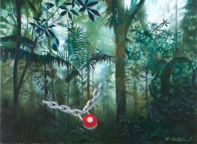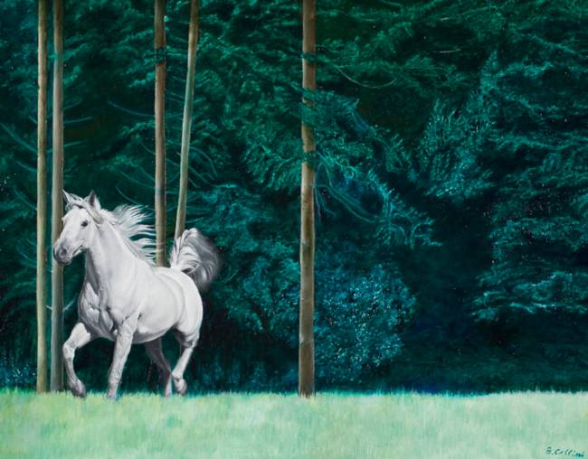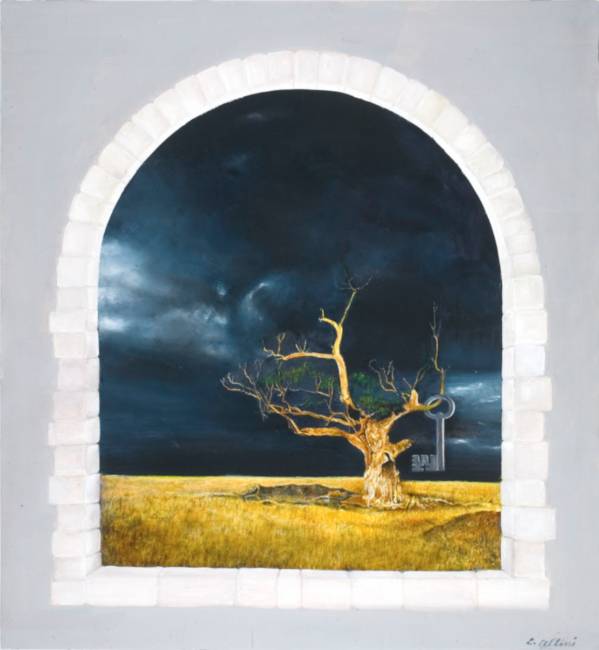 Cellini said she did not set out to make a painting that balanced gloom and hopefulness. Only upon later reflection did she begin to realize that the elements of the piece represented her mood. "I had lots of problems at that time, physical problems," said Cellini, who is tiny and claims to have trouble walking, but hardly seems frail or lacking in energy or mental acuity. "Cataracts. I had concerns about that. Without my eyes, I can't paint. But I'm a hopeless optimist.